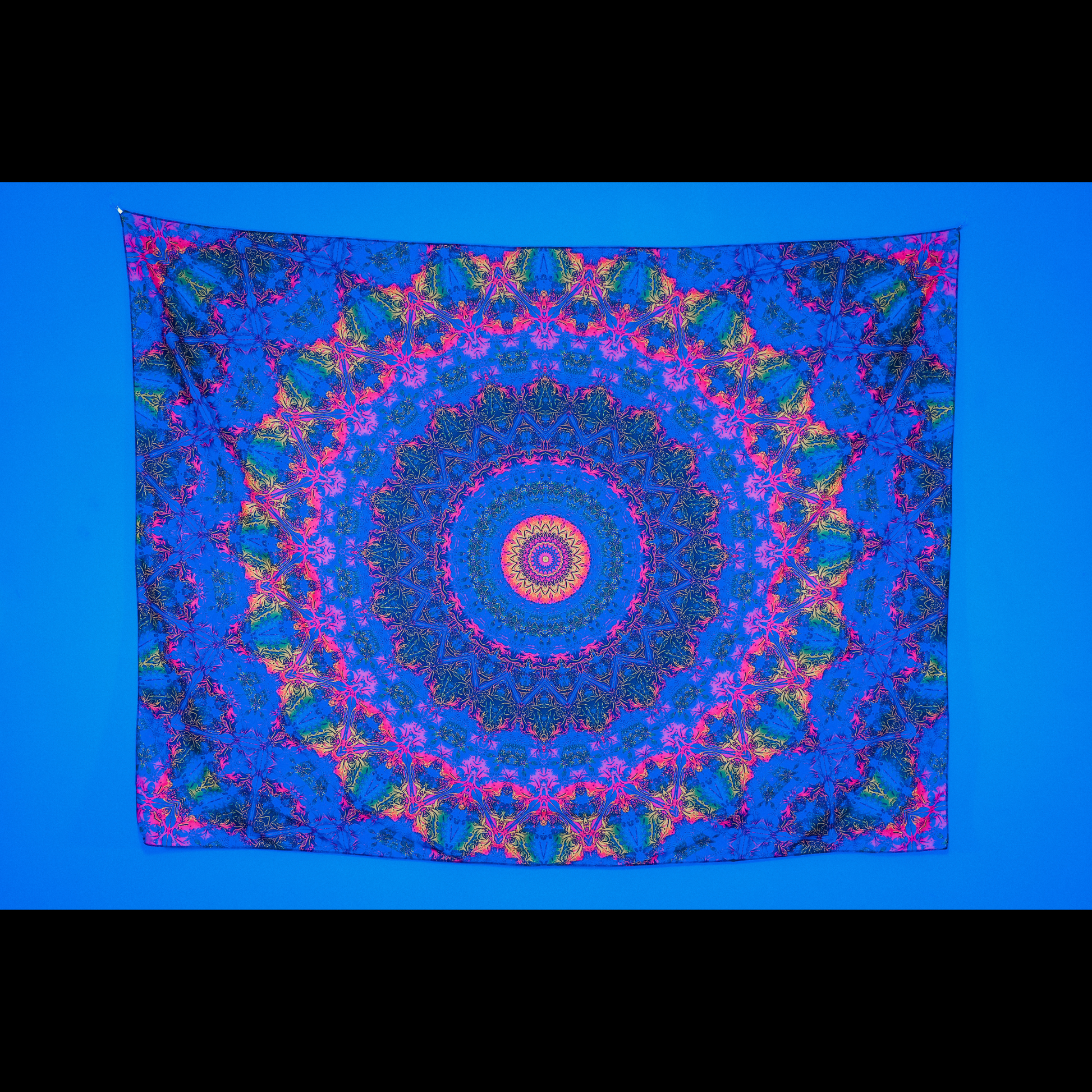 Inspired by sacred mandalas and cosmic symmetry, this UV-reactive psychedelic tapestry radiates endless patterns that expand outward from the center, creating a deep meditative and immersive visual experience.