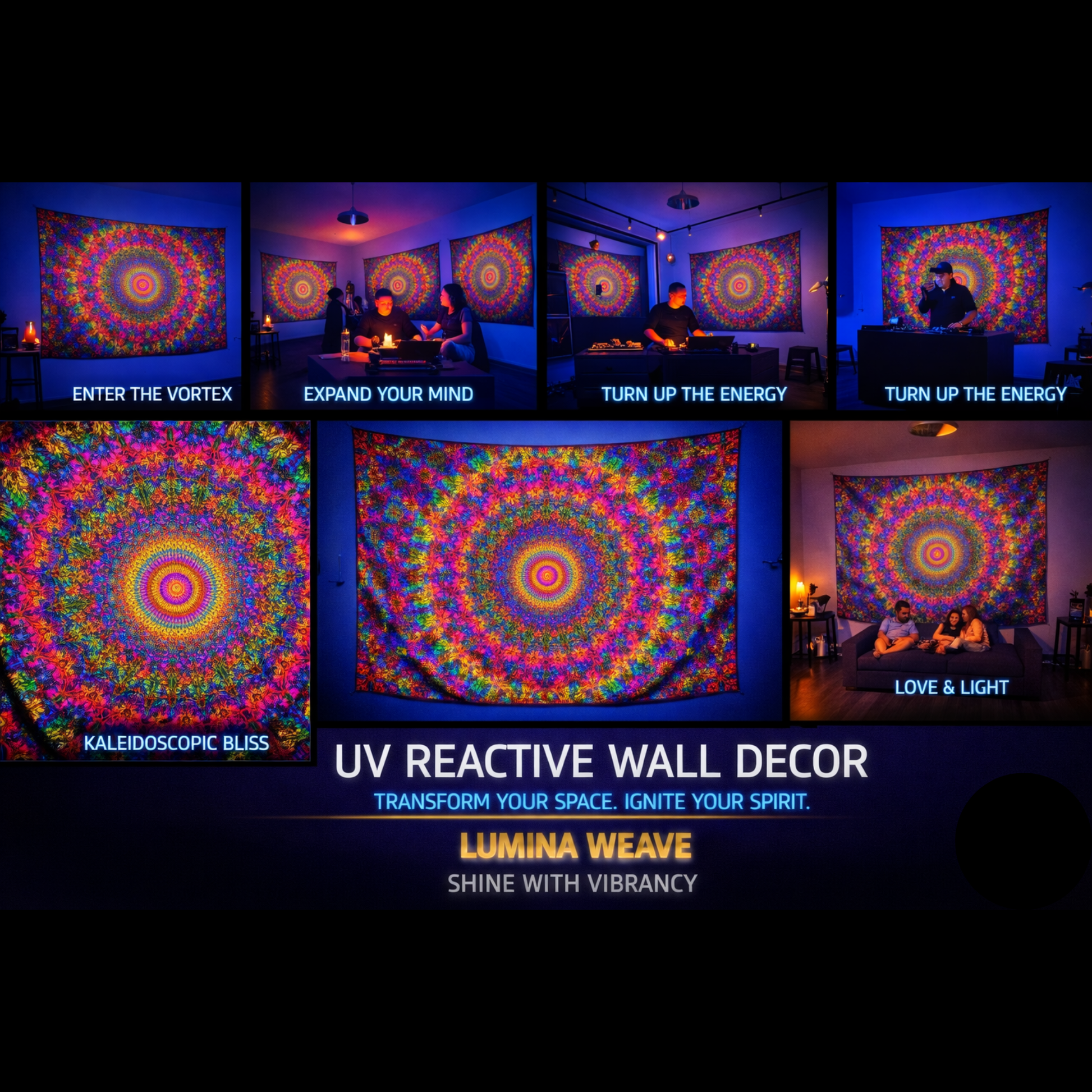 Under UV light, the colors intensify into a hypnotic spectrum, making it perfect for meditation spaces, psytrance environments, studios, and festival backdrops.